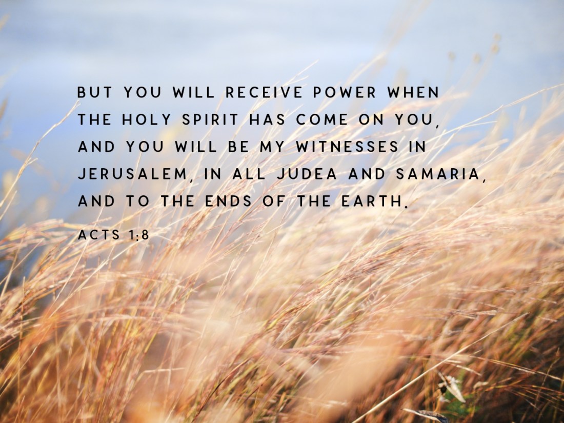 “For John baptized with water, but you will be baptized with the Holy Spirit not many days from now… But you will receive power when the Holy Spirit has come upon you, and he will be my witnesses in all Judea and Samaria, and to the ends of the earth.”