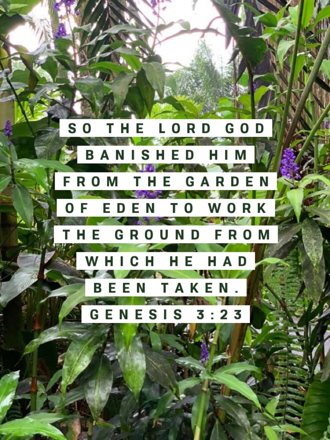 “The Lord God said, “Since man has become like one of Us, knowing good and evil, he must not reach out, take from the tree of life, eat, and live forever.” So the Lord God sent him away from the garden of Eden to work the ground from which he was taken.”