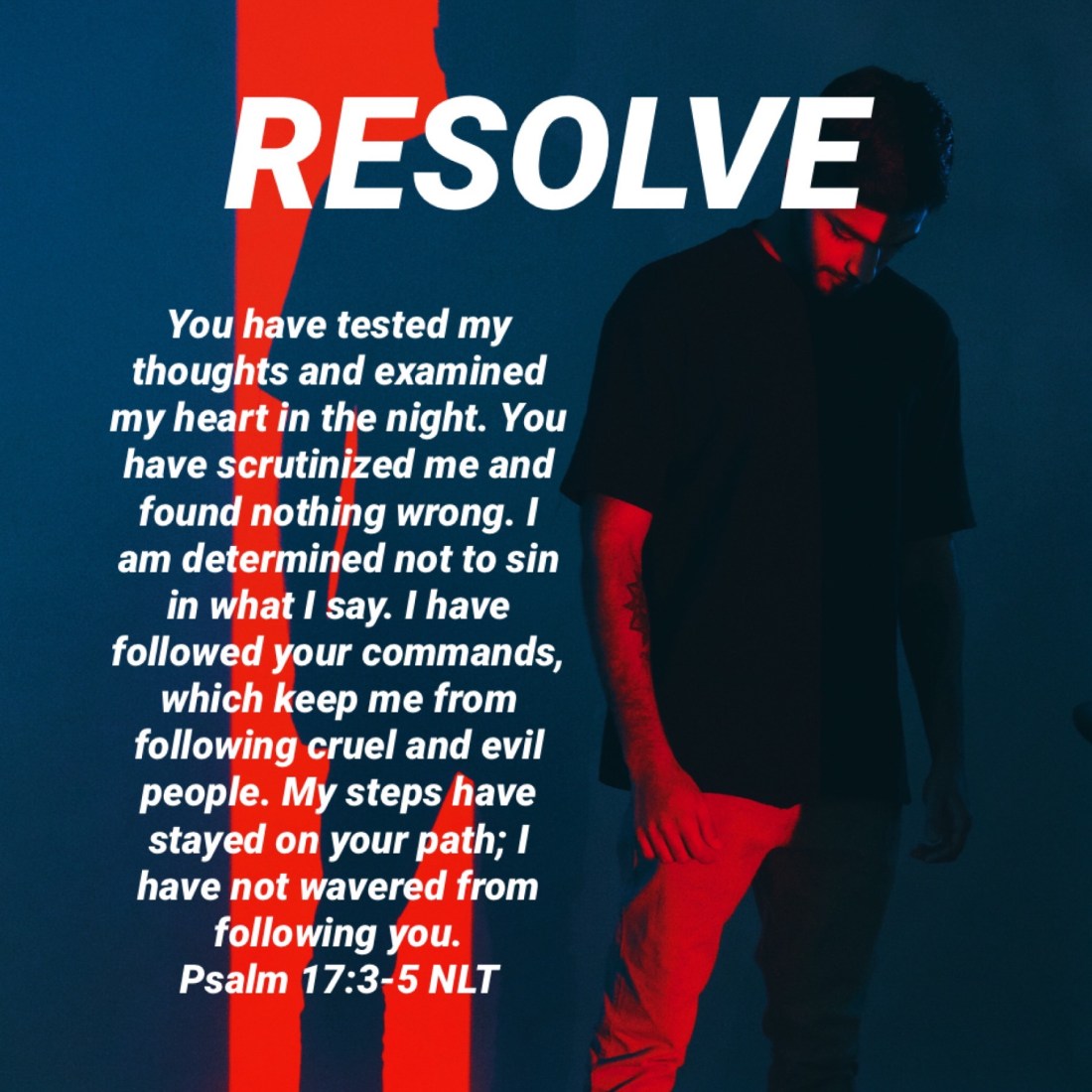 You have tested my thoughts and examined my heart in the night. You have scrutinized me and found nothing wrong. I am determined not to sin in what I say. I have followed your commands, which keep me from following cruel and evil people. My steps have stayed on your path; I have not wavered from following you.