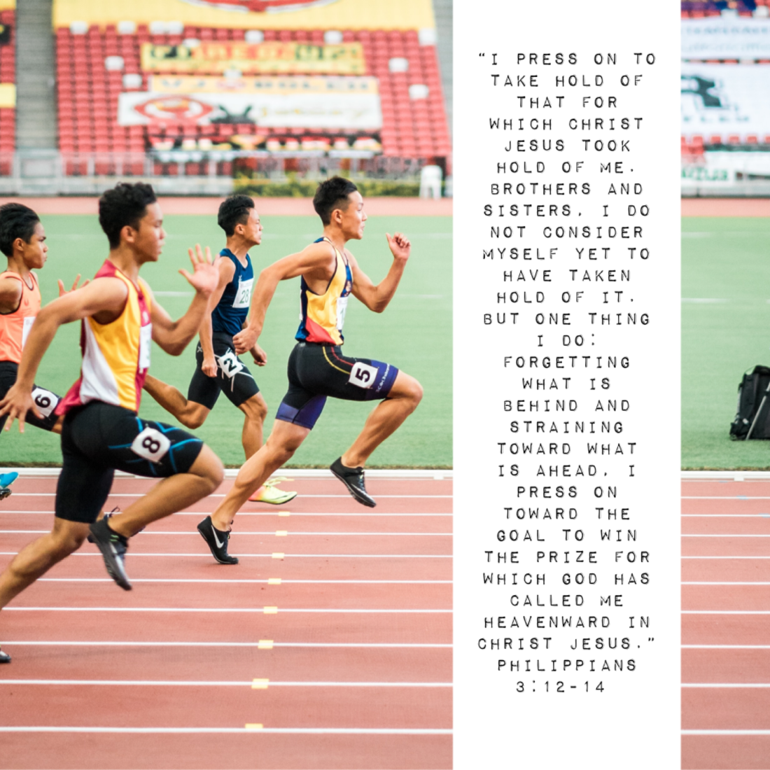 “I press on to take hold of that for which Christ Jesus took hold of me. Brothers and sisters, I do not consider myself yet to have taken hold of it. But one thing I do: Forgetting what is behind and straining toward what is ahead, I press on toward the goal to win the prize for which God has called me heavenward in Christ Jesus.”