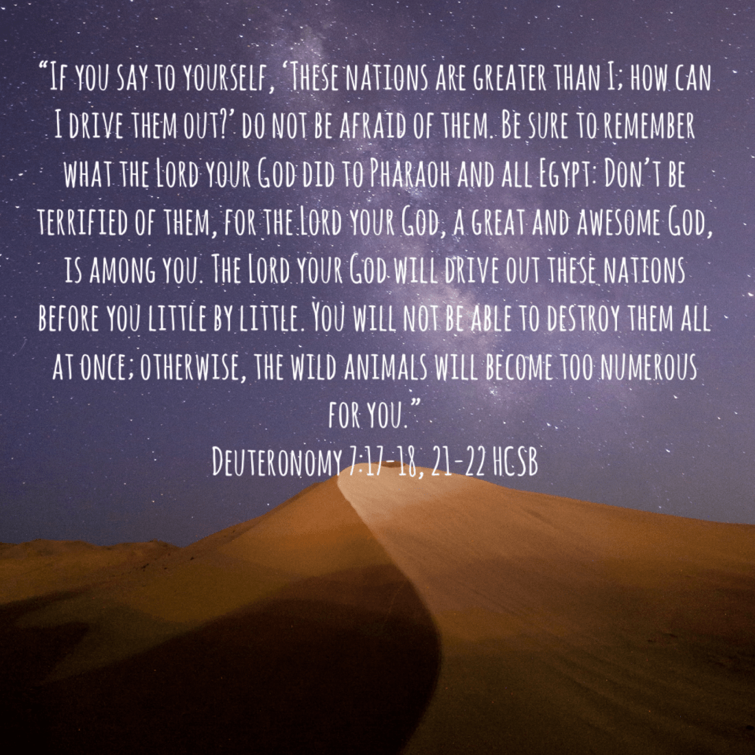 “If you say to yourself, ‘These nations are greater than I; how can I drive them out?’ do not be afraid of them. Be sure to remember what the Lord your God did to Pharaoh and all Egypt: Don’t be terrified of them, for the Lord your God, a great and awesome God, is among you. The Lord your God will drive out these nations before you little by little. You will not be able to destroy them all at once; otherwise, the wild animals will become too numerous for you.”