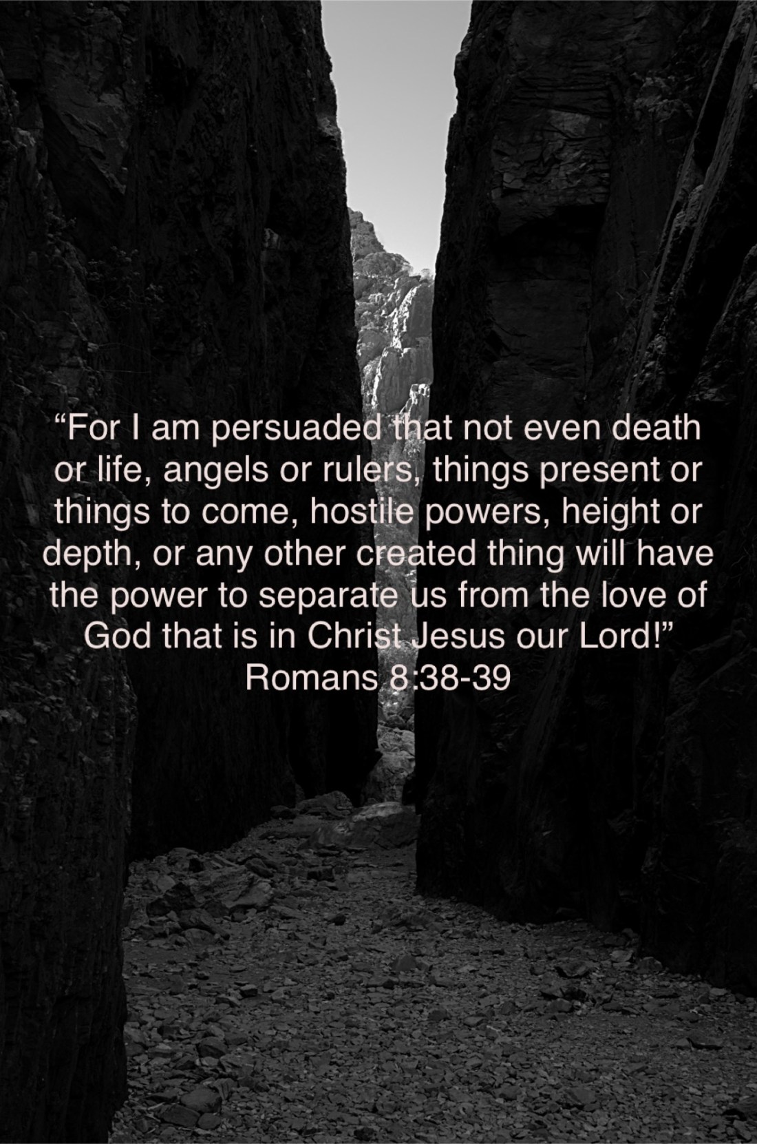 “For I am persuaded that not even death or life, angels or rulers, things present or things to come, hostile powers, height or depth, or any other created thing will have the power to separate us from the love of God that is in Christ Jesus our Lord!”