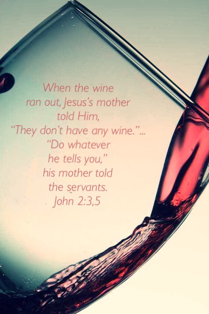 “On the third day there was a wedding at Cana in Galilee, and the mother of Jesus was there. Jesus also was invited to the wedding with his disciples. When the wine ran out, the mother of Jesus said to him, “They have no wine.” And Jesus said to her, “Woman, what does this have to do with me? My hour has not yet come.” His mother said to the servants, “Do whatever he tells you.””