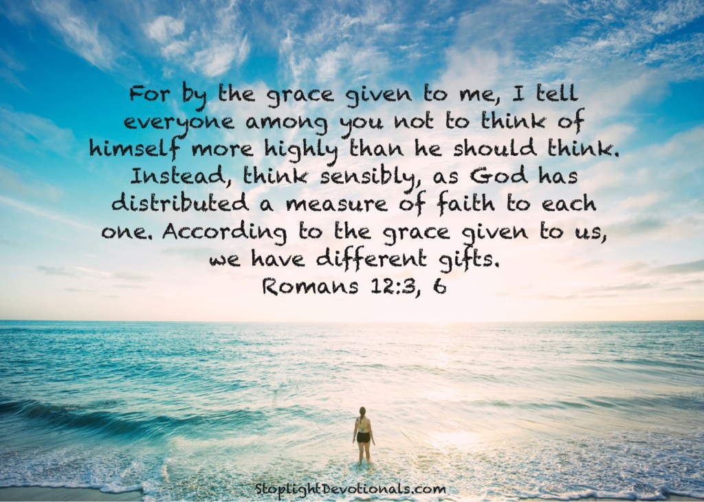 “For by the grace given to me, I tell everyone among you not to think of himself more highly than he should think. Instead, think sensibly, as God has distributed a measure of faith to each one. According to the grace given to us, we have different gifts,”