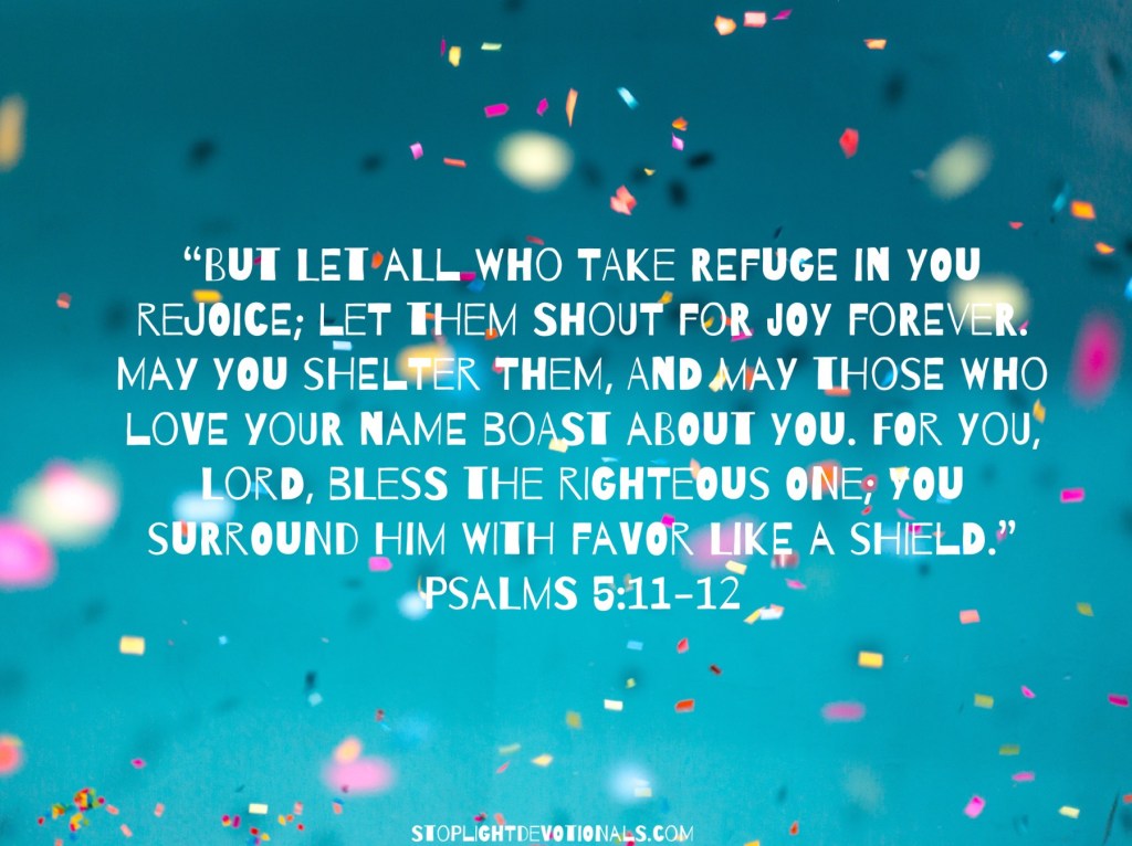 “But let all who take refuge in You rejoice; let them shout for joy forever. May You shelter them, and may those who love Your name boast about You. For You, Lord, bless the righteous one; You surround him with favor like a shield.”