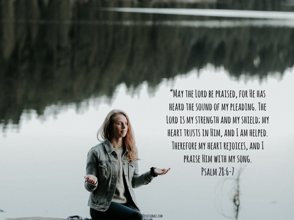 “May the Lord be praised, for He has heard the sound of my pleading. The Lord is my strength and my shield; my heart trusts in Him, and I am helped. Therefore my heart rejoices, and I praise Him with my song. The Lord is the strength of His people; He is a stronghold of salvation for His anointed. Save Your people, bless Your possession, shepherd them, and carry them forever.”