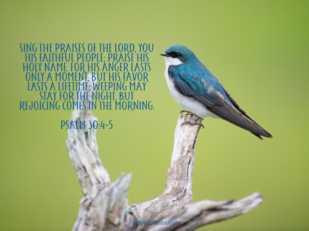 “Sing the praises of the Lord, you his faithful people; praise his holy name. For his anger lasts only a moment, but his favor lasts a lifetime; weeping may stay for the night, but rejoicing comes in the morning.”