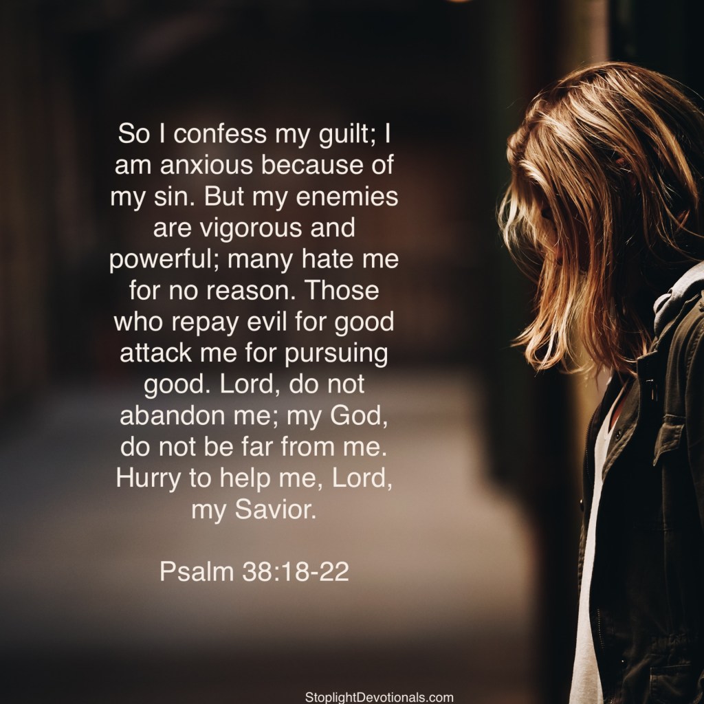“So I confess my guilt; I am anxious because of my sin. But my enemies are vigorous and powerful; many hate me for no reason. Those who repay evil for good attack me for pursuing good. Lord, do not abandon me; my God, do not be far from me. Hurry to help me, Lord, my Savior.”