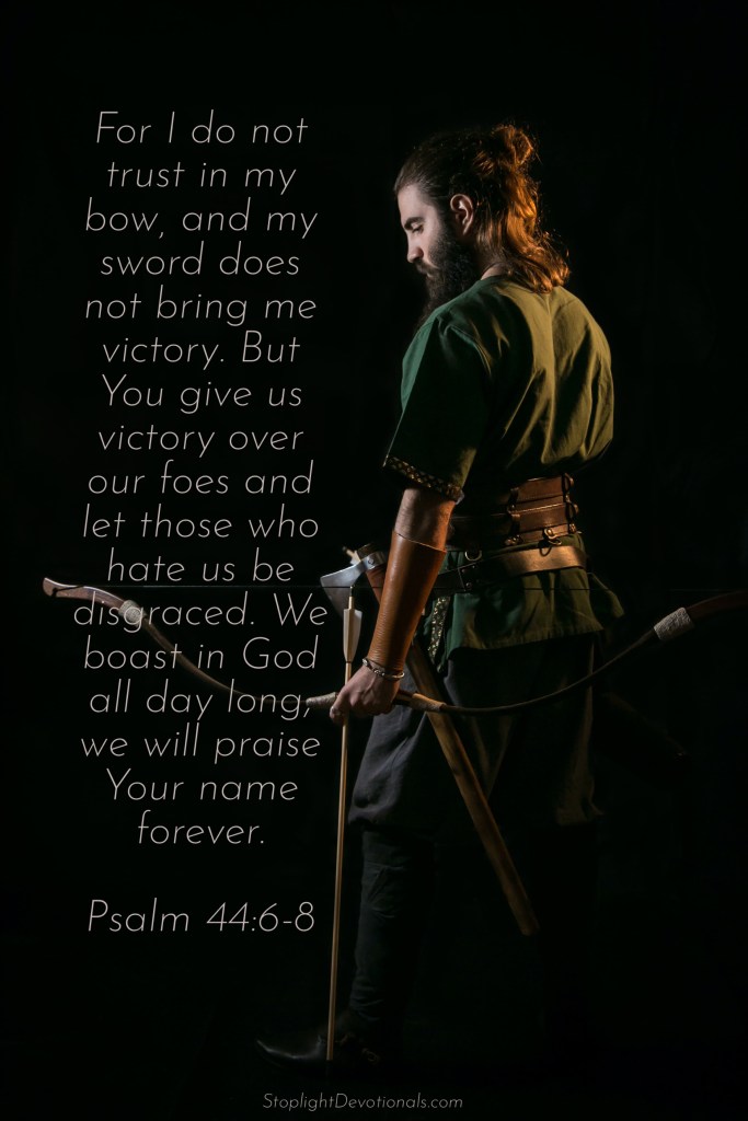 “You are my King, my God, who ordains victories for Jacob. Through You we drive back our foes; through Your name we trample our enemies. For I do not trust in my bow, and my sword does not bring me victory. But You give us victory over our foes and let those who hate us be disgraced. We boast in God all day long; we will praise Your name forever. Selah”