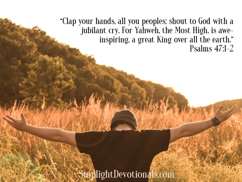 “Clap your hands, all you peoples; shout to God with a jubilant cry. For Yahweh, the Most High, is awe-inspiring, a great King over all the earth. He subdues peoples under us and nations under our feet. He chooses for us our inheritance — the pride of Jacob, whom He loves. Selah”