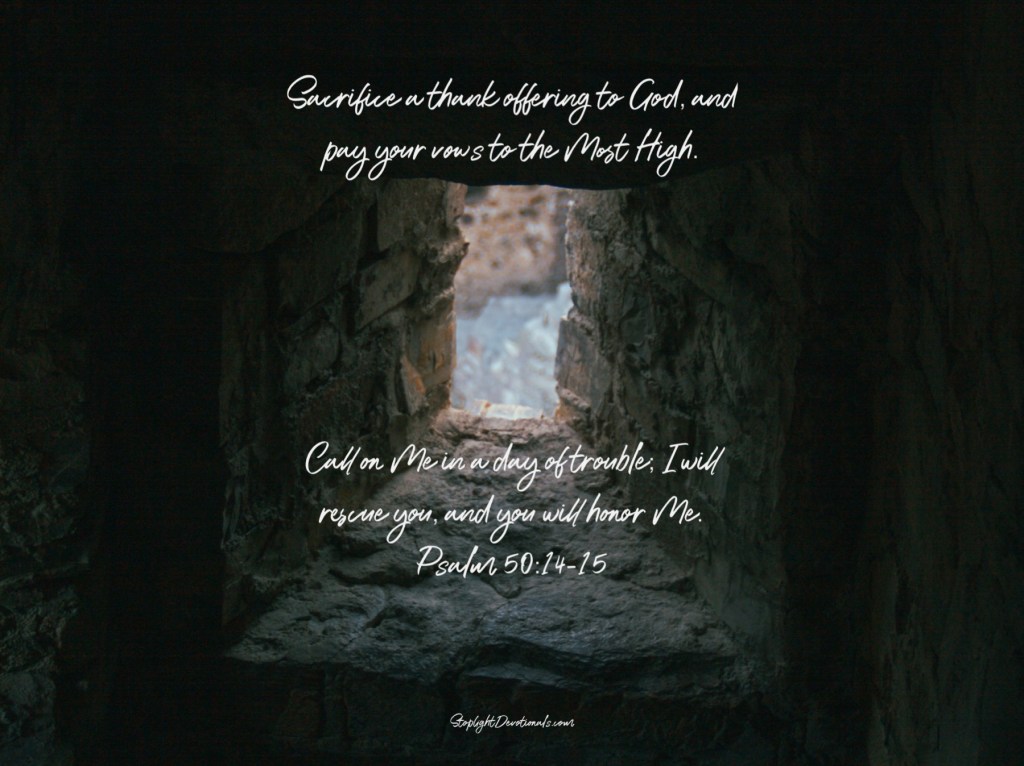 “Sacrifice a thank offering to God, and pay your vows to the Most High. Call on Me in a day of trouble; I will rescue you, and you will honor Me.””